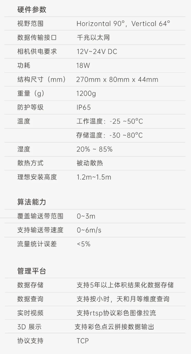 首页 动态 端到端 更易用丨人加®散料运输动态监测与预警系统全新上市 端到端 更易用丨人加®散料运输动态监测与预警系统全新上市 新品上市 2025-02-20 浏览量:164 在各类涉及散料运输的行业场景中,普遍面临着诸多棘手问题,严重影响生产效率、成本控制以及生产安全,作为具备端到端能力的 3D 视觉智能化解决方案专家,人加机器人公司正式推出软硬件一体化智能散料运输动态监测与预警系统,护航全场景散料运输,助力多行业生产效率提升。 方案介绍 人加®散料运输动态监测与预警系统 司眸® RGBD 智能相机 司眸®VAE020-800-X180是人加机器人公司最新自主研发的升级款 工业级RGBD感算一体式智能相机产品,基于双目散斑结构光感知技术,异构3D实时成像技术提供更精细的深度感知,在SLAM、三维重建技术加持下,提升点云数据精度和图像处理能力,升级的增强光学投射系统,缩短曝光时长,减少运动模糊,更适用于高速场景。 智能料流检测软件 人加公司智能料流检测软件,内置自研高精度料流测量算法,可全面监测输送带的运行速度、流量体积、堆料高度、块料大小、欠载状态、皮带跑偏等信息,实现输送带散货物流精细化监测。 监测管理平台 客户端软件支持实时视频查看、历史数据查询、实时人机交互控制。 系统功能 流量统计 司眸®VAE020-800-X180 RGBD 智能相机动态采集输送带上物料的三维数据,结合高精度流量体积测量算法,生成精准流量体积数据。 支持皮带速度:6m/s 数据查询:支持按小时、天和月等维度查询 自动测速 该方案能够自动测量输送带运动速度,确保及时发现异常,结合报警系统可防止设备故障或安全事故,同时实现料流精细化控制,优化输送调度,提升输送效率。 环境条件:需具备照明条件 覆盖输送带宽度:0 ~ 3m 块料检测 通过三维点云数据分析,能够识别自定义参数范围出现的块料,并突出标记,同时实时跟踪,并进行系统预警。 支持皮带速度:≤ 6m/s 块料参数自定义:支持 煤堆监测 实时监测料流高度,当发现料流高度过高可能导致物料堆积堵塞时,及时预警。 检测精度:毫米级 覆盖皮带宽度:0~3m 欠载检测 当检测到料流高度过低时,表明输送带此时处于欠载状态,系统可及时预警,消除生产安全隐患,提升生产效率。 检测精度:毫米级 覆盖输送带宽度:0~3m 跑偏检测 自主设定跑偏阈值,算法自动比较皮带实时偏移量和设定阈值,判断输送带是否偏离正常轨道,输出计算跑偏幅度和方向,显示具体数值,同时可及时发出警报。 检测精度:毫米级 覆盖输送带宽度:0~3m 核心优势 01 高精度测量,数据稳定输出 测量精度可达毫米级,测量结果与实际物料流量误差小于5%; 支持深度数据和RGB数据同步对齐输出; 02 超大景深,超宽视野 测量输送带宽度达3m; 测量堆料高度达1.5m; 03 部署简单,安装便捷 无需改变现场环境即可快速安装; 调试简单,系统易于维护; 04 端侧AI,架构简洁 数据传输延迟更低; 不需要额外工控机计算设备; 更省安装与维护成本; 05 一个平台,多个应用 单机实现散料皮带流量监控、堆煤、跑偏、测速等多种应用; 06 RGBD应用开发平台 司眸®RGBD智能相机可作为应用开发平台,持续衍生出更多闭环应用; 07 快速响应防爆需求 针对防爆需求,提供10mm厚度防爆玻璃解决方案,确保在防爆环境下正常使用而不影响3D成像效果; 方案能力 应用场景 Human+™人加®深耕机器视觉领域近十年,3D 视觉 AI 技术积累深厚,经过长期自主研发,现已推出A系列、P系列,T系列、AT系列双目 3D 相机产品,基于自研 3D 相机,为客户和合作伙伴提供端到端的「3D 视觉+AI 」 自动化解决方案,打造软硬件一站式闭环服务体验。 我们一直秉持以服务客户为中心,将技术与产品创新作为对客户、行业和社会应尽的责任。未来,Human+™人加®将坚持探索前沿科技创新,始终致力于各行业智能化转型升级,促进全社会生产效益提升。 上一个:小尺寸 更灵活丨人加3D相机PEA020-800-Y80S上新,助力多场景智造升级 返回列表 下一个:没有了 更多新闻推荐 小尺寸 更灵活丨人加3D相机PEA020-800-Y80S上新,助力多场景智造升级 新品上市 2024-09-29 目前主流3D视觉技术各有什么优劣势?如何选择最Match的工业3D相机? 技术科普 2024-08-12 【最全选型攻略】挑选合适的工业相机,必须提前考虑12要素! 工业相机 2024-07-16 场景应用丨ylzz线路检测智能煤流监测系统全新升级,赋能自动化煤流管控 场景应用 2024-07-08 场景应用丨ylzz线路检测3D视觉+AI深度学习,助超大型货物体积测量更准,更稳,更易用 场景应用 2024-06-04 超高读取 极致易用丨ylzz线路检测发布RGBD动态包裹体积测量智能相机 新品发布 2024-04-26